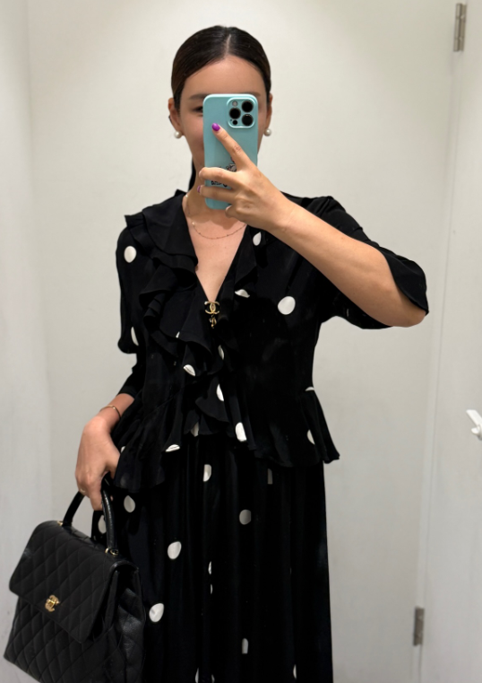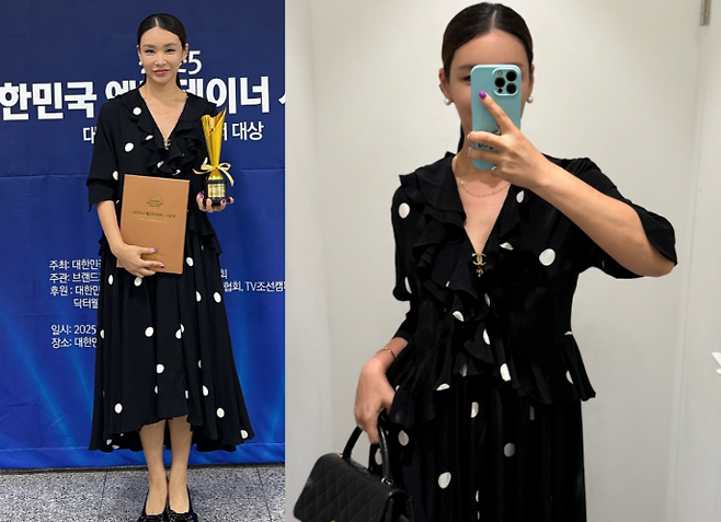 배윤정은 최근 도트 자켓과 도트 스커트를 매치한 트렌디하면서도 우아한 패션을 선보였습니다. 검정색 도트 자켓과 스커트는 적당히 우아하면서도 스타일리시함을 강조했습니다. 그녀는 볼드한 귀걸이와 얇은 네크리로 고급스러운 느낌을 더했고, 블랙 핸드백으로 심플하게 마무리하며 전체적으로 세련된 룩을 완성했습니다.