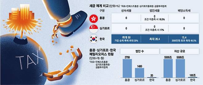 반면 한국은 세금 부담이 커 패밀리오피스 산업 육성에 근본적인 한계가 있다는 지적이다. 한국의 상속세와 법인세 최고세율은 각각 50%, 26.4%다. 배당소득세도 2000만원 초과 시 최대 49.5%다. 홍콩, 싱가포르와 비교하면 고액의 세금 부담이 발생한다. 글로벌 외국자본이 진입하기 꺼려하는 부분이다.