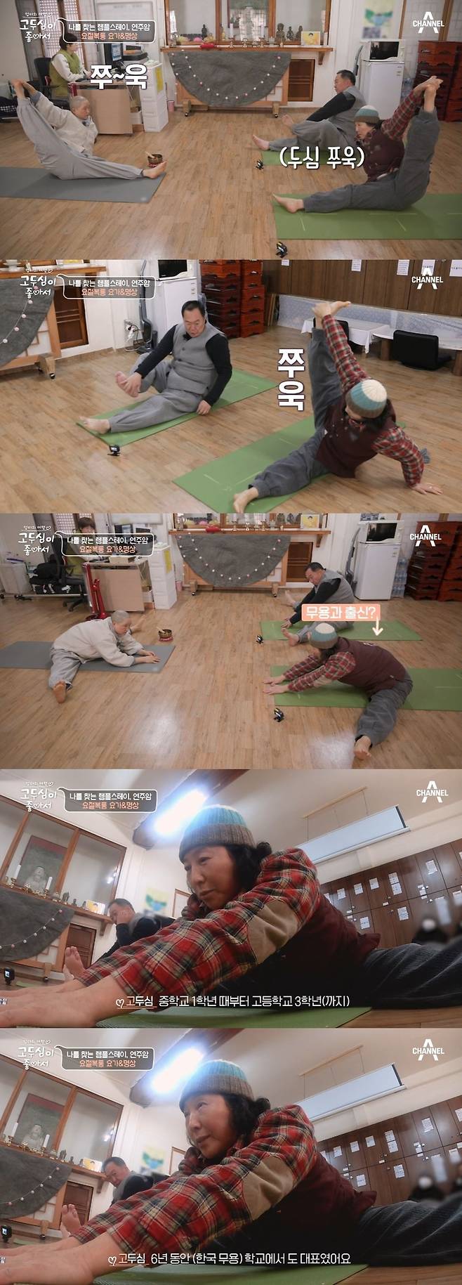 이날 고두심은 절을 찾아온 배우 박상면과 함께 요가 시간을 가졌다. PD는 스님에게 "고두심 선생님이 무용과 출신이다"라고 말했다.