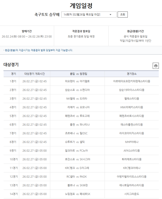 한편, 축구토토 승무패 14회차는 2월 24일(화) 오전 8시부터 발매를 개시해 2월 26일(목) 밤 11시까지 구매할 수 있다.