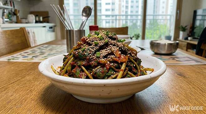 머위는 줄기 겉껍질의 억센 부분을 손으로 벗겨낸다. 잎과 줄기를 분리하지 않고 통째로 준비하되, 너무 굵은 줄기는 반으로 갈라두면 양념이 고루 배어든다. 끓는 물에 소금 1작은술을 넣고 머위를 넣어 2분 30초간 데친다. 너무 오래 데치면 식감이 무너지고 향이 날아가니 시간을 지키는 게 좋다. 데친 머위는 바로 찬물에 헹궈 물기를 꽉 짠 뒤 4~5cm 길이로 썬다.