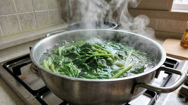 ② 굵은 줄기는 반으로 갈라 끓는 소금물에 2분 30초간 데친다.