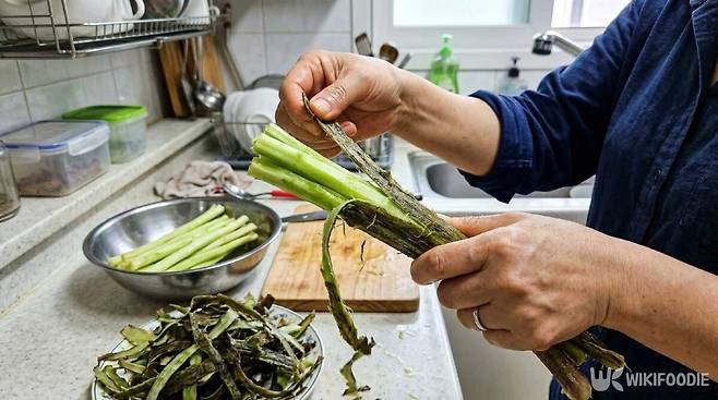 ① 머위 줄기 겉껍질의 억센 부분을 손으로 벗겨낸다.
