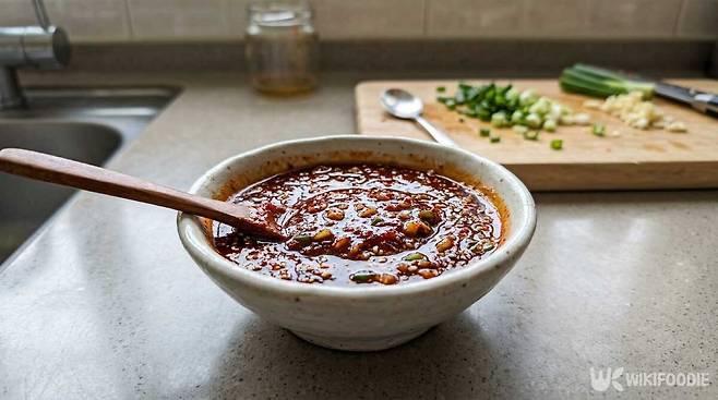 ④ 볼에 고추장, 된장, 매실청, 식초, 다진 마늘을 넣고 양념장을 만든다.