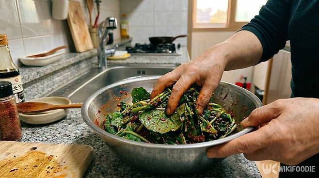 썰어둔 머위를 양념장에 넣고 조물조물 무친다. 손으로 무쳐야 양념이 줄기 사이사이에 골고루 배어든다. 마지막으로 참기름 1큰술과 깨소금 1작은술을 넣고 한 번 더 가볍게 버무리면 완성이다. 바로 먹어도 맛있지만 냉장고에 30분 두었다가 먹으면 양념이 더 깊이 배어 맛이 올라간다.