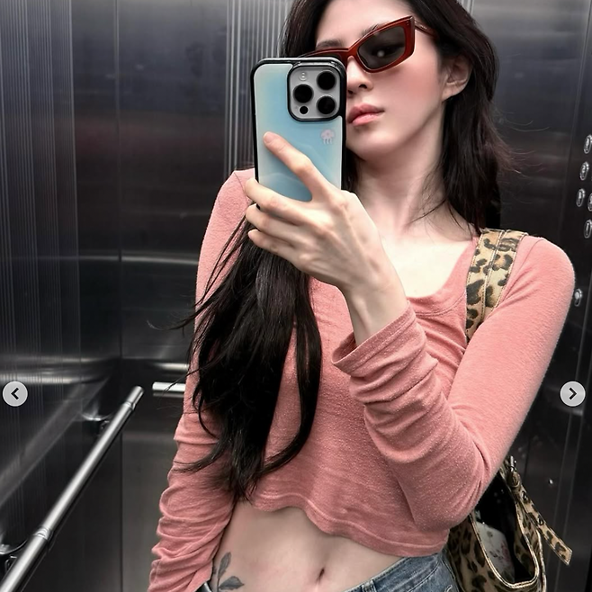 피치핑크 크롭탑 아래 자연스럽게 드러난 복부 타투가