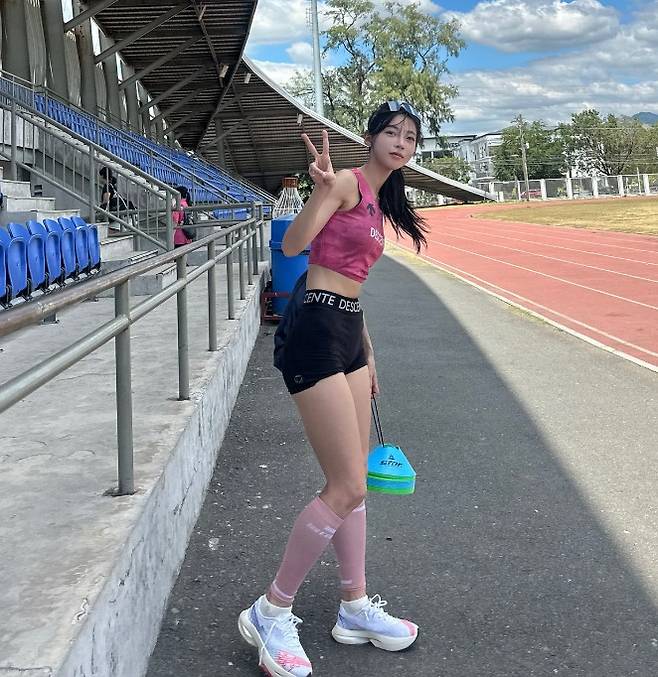 김민지는 육상계의 카리나라고 불리며 '골때리는 그녀''솔로지옥'에 출연해 방송 활동을 하고 있다.