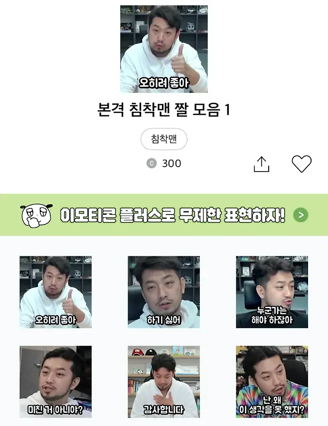 침착맨의 짤로만 구성된 카카오톡 이모티콘이 세상에 나왔다. ‘본격 침착맨 짤 모임 1’이라는 이름의 이모티콘이다. ‘1’이 붙은 걸 보니 2탄 3탄도 고려 중인 걸까. ‘이 몸 등장’, ‘아이고 배야’, ‘오히려 좋아’ 등의 움직이는 침착맨 이모티콘을 볼 수 있다. 폰트도 침착맨 영상의 대표 폰트를 동일하게 사용했다고. 가격은 3,800원. 침착맨 팬이라면 놓칠 수 없다.