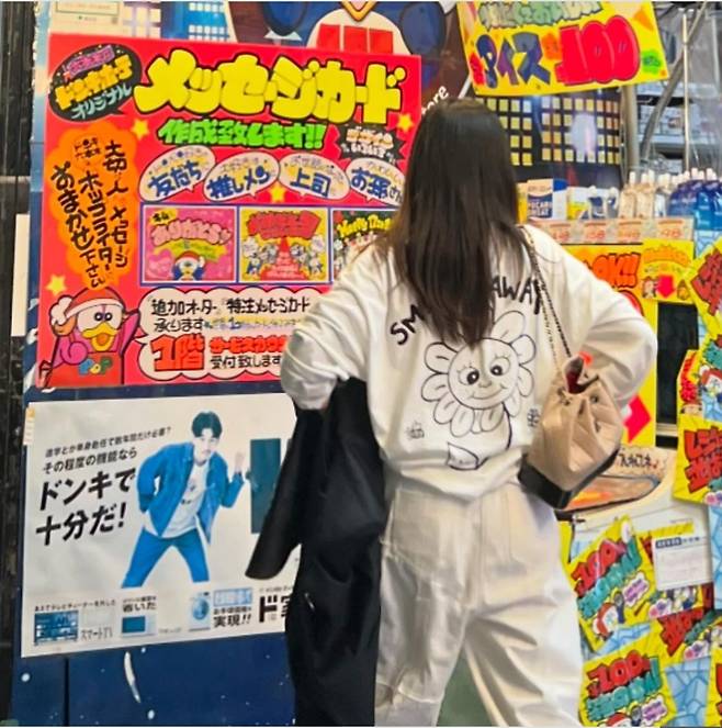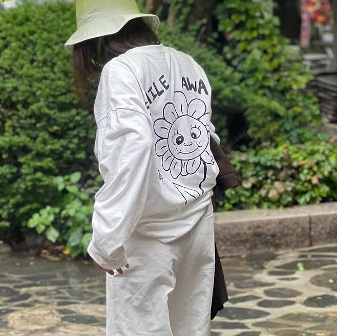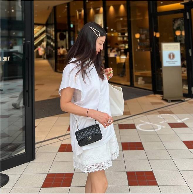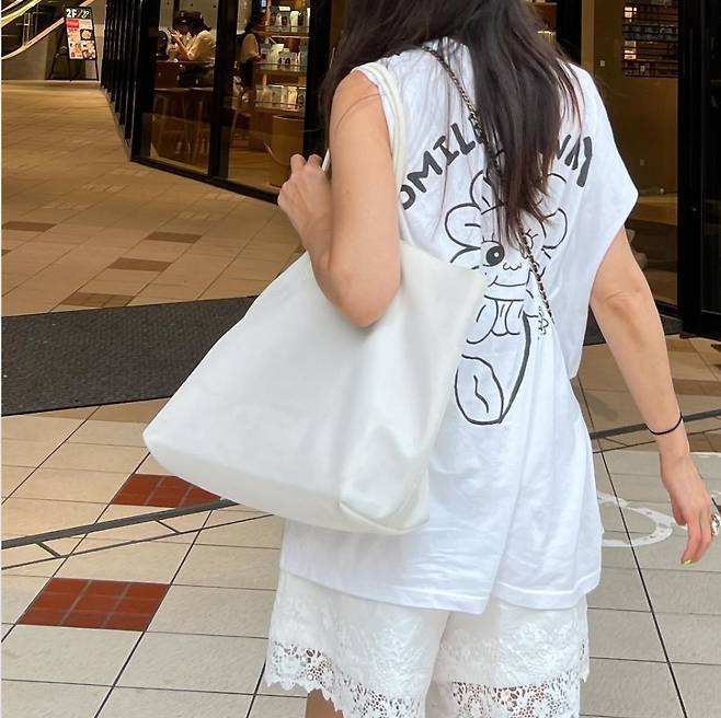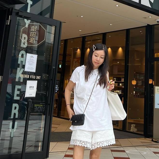 황신혜는 등에 프린팅이 돋보이는 흰티를 착용해 깔끔하면서도 스타일리시한 패션을 선보였습니다.