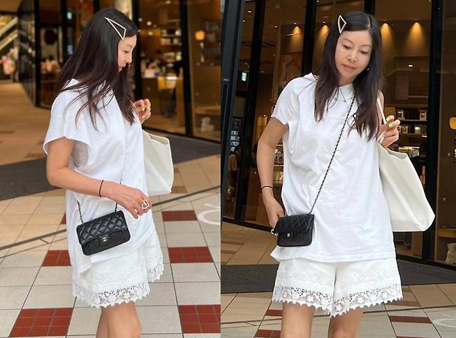 또, 황신혜는 아이보리 레이스 꽃바지를 착용해 청순하고 화사한 코디를 완성했습니다.