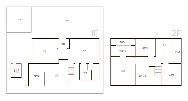 저희 집은 단독 주택 치고는 평범한 구조의 집이에요. 이 지역에서 마당이 이 정도로 넓은 집은 드물었고 아이들을 위한 배려와 꼭 필요한 곳만 있는 알찬 구조가 마음에 들어서 이 집으로 이사 오게 되었어요. 1층은 공용 공간이고, 2층은 각자의 방이 있는 곳이랍니다.
