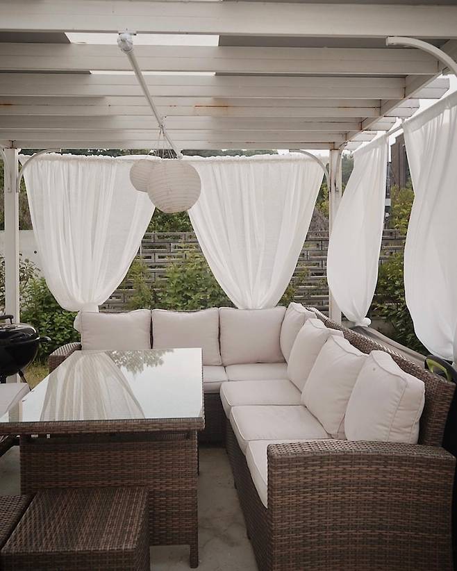 가을에는 좀 더 포근한 공간이 돼요. 쇼파 테이블은 가족과 손님들이 와서 쉬기에 적당합니다. 야외 가구 관리법 궁금해 하시는 분들이 많으신데, 장마철에는 쿠션을 따로 넣어 보관해요. 평소에는 그냥 두고 쓰다가 가끔 세탁해줍니다.