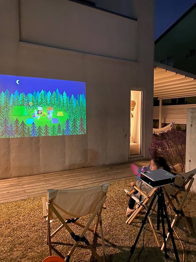 가을과 봄에는 마당 캠핑을 즐기기 적당해서 빔을 쏘고 휴식을 취하거나 고기를 구워 먹어요.