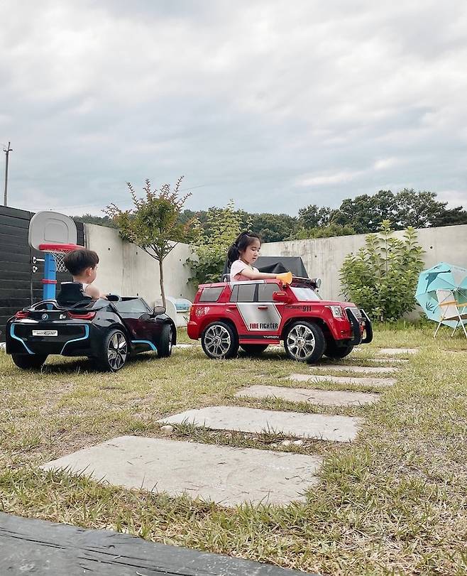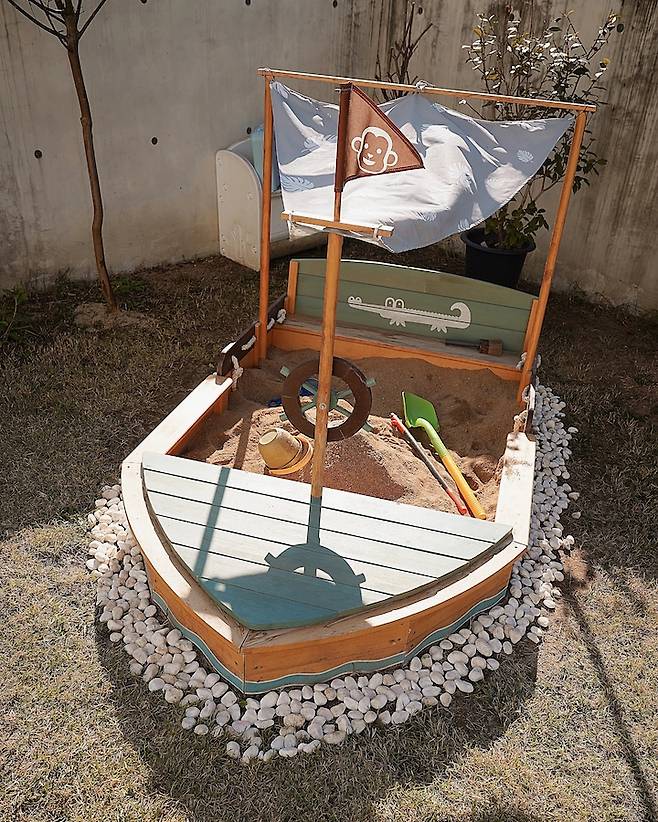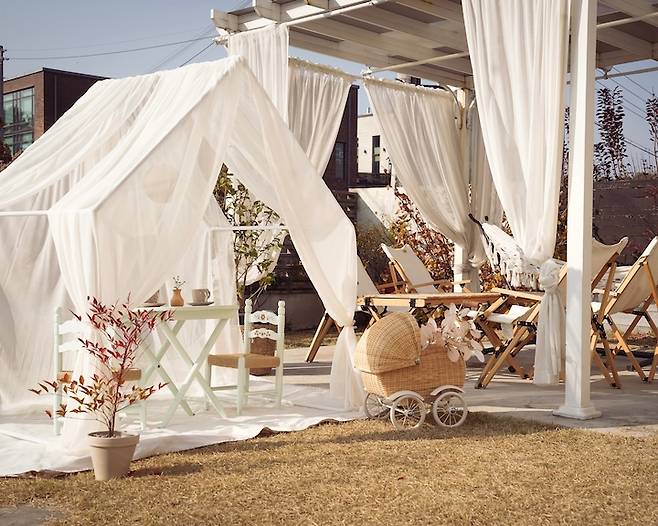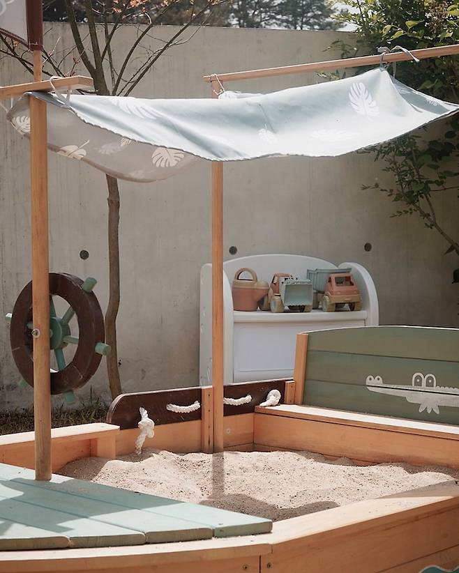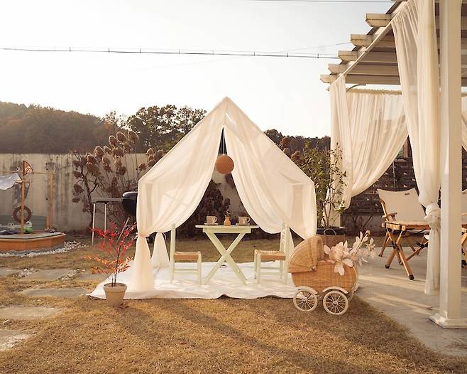 때로는 아이들의 휴식 공간을 따로 마련해주기도 해요. 캐노피 하나 마당에 뒀을 뿐인데 어디 놀러 가는 것보다 훨씬 예쁜 포토 스팟도 만들어집니다.