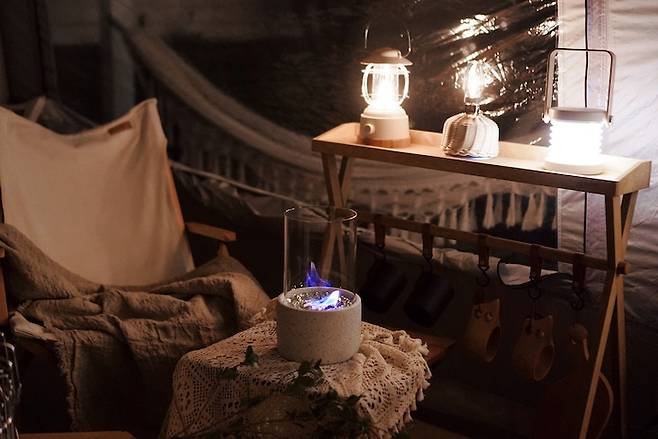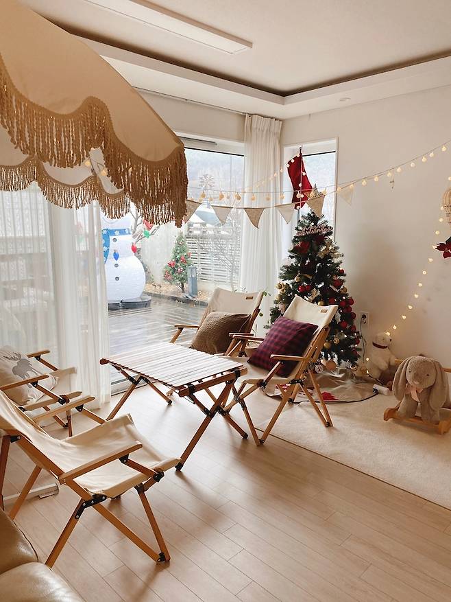겨울에는 장박 텐트를 마당에 쳐놓고 캠핑이나 불멍을 즐기기도 합니다.