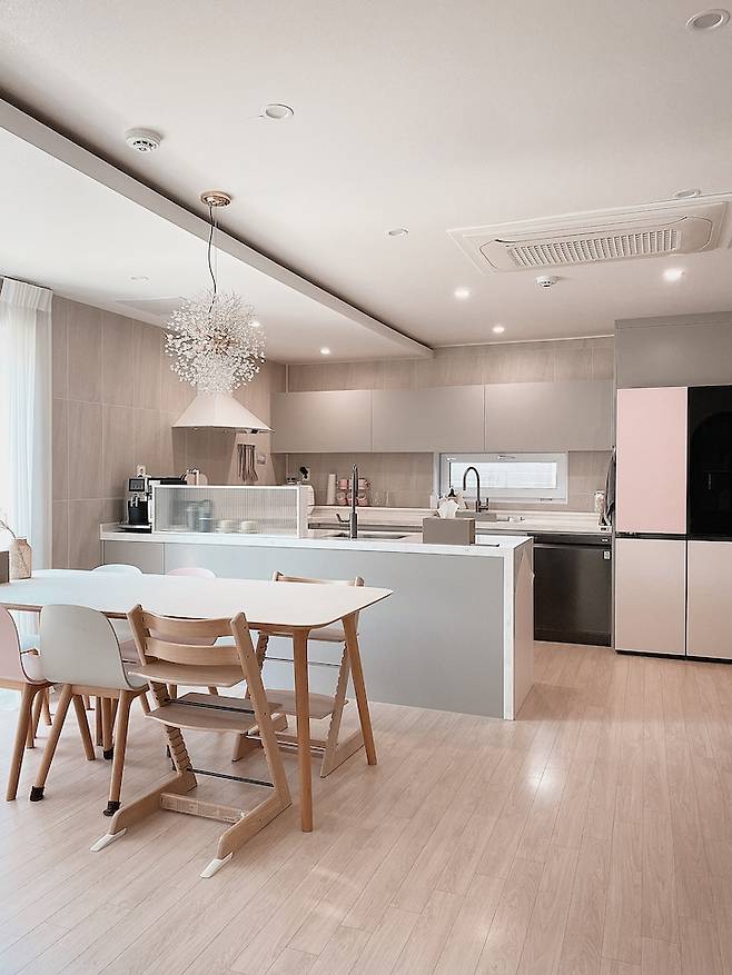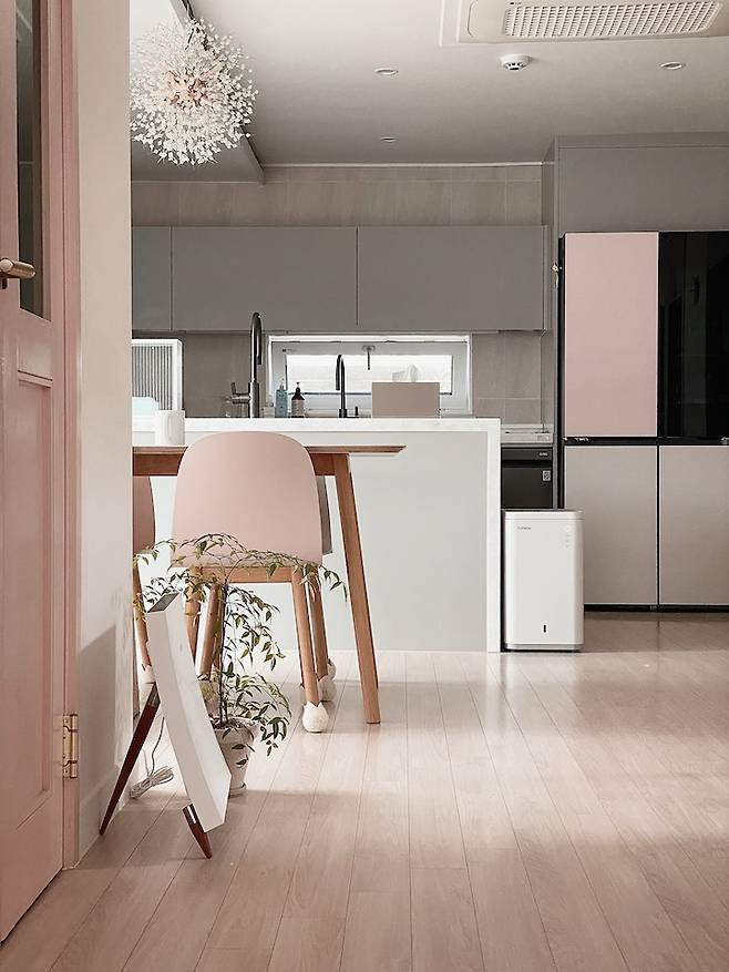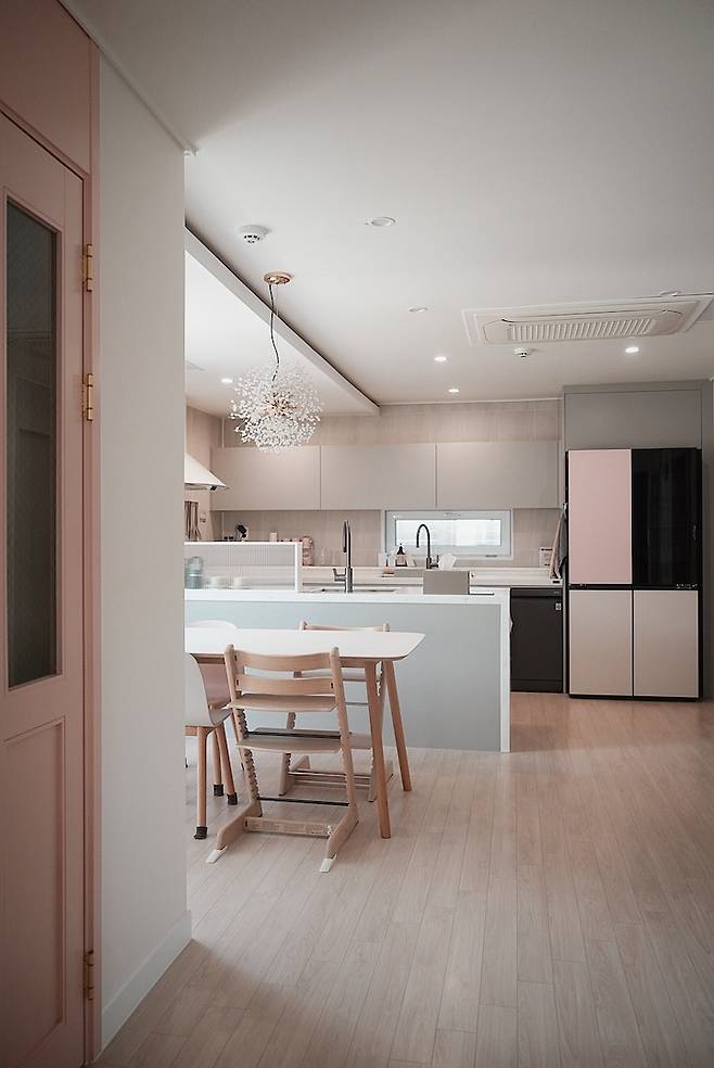 주방은 제가 좋아하는 핑크 계열을 써서 인테리어를 했어요. 제가 가장 많이 쓰는 공간이다 보니 제 취향이 많이 들어가 있습니다.