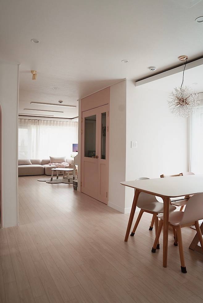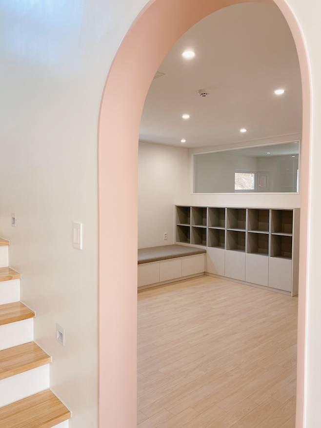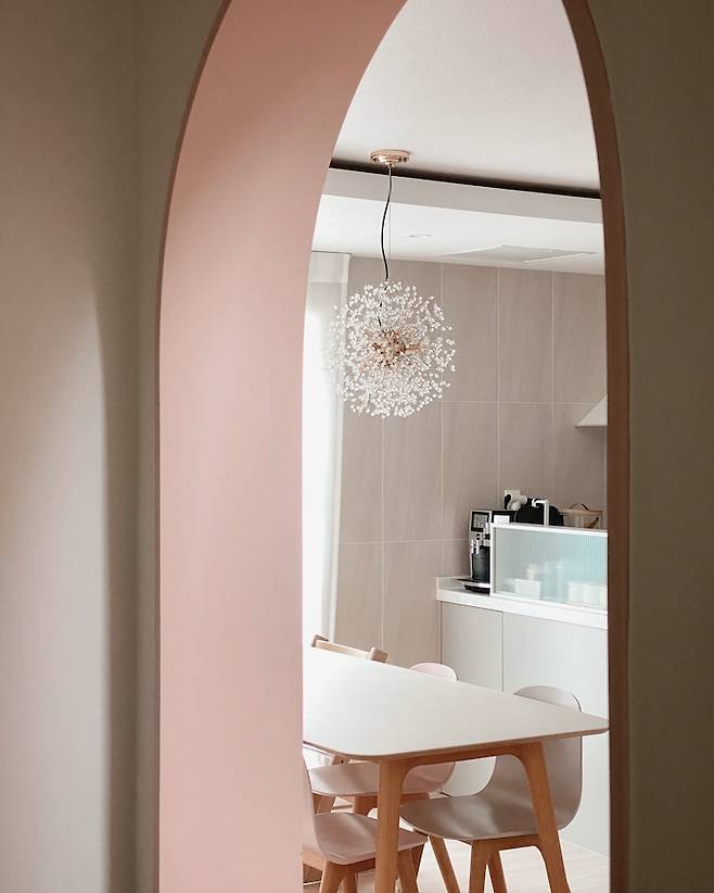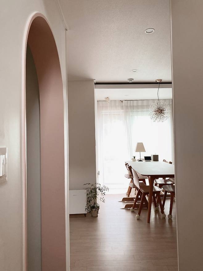 주방 옆에 있는 현관 중문과 서재의 아치형 문도 핑크 계열로 통일했어요. 주방 청소 싹 하고 서재 안에서 아치형 문을 통해 주방을 보거나, 계단 위에서 주방을 보면 기분이 좋아지고 뿌듯하답니다 ^^