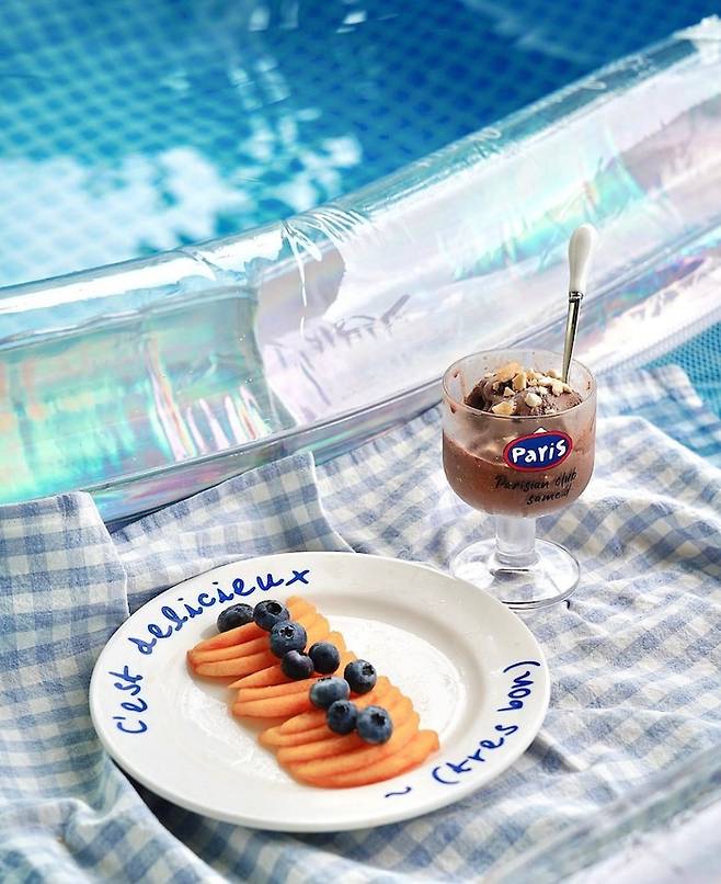 여름에는 커다란 4x2미터 짜리 풀장을 설치해요. 물을 반나절 이상 받아야 하기 때문에 매번 갈지는 못하고 소금 필터를 이용하여 소독을 해주고 있습니다.