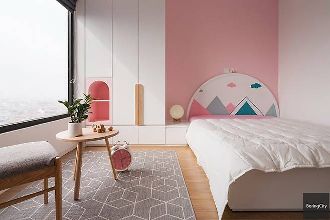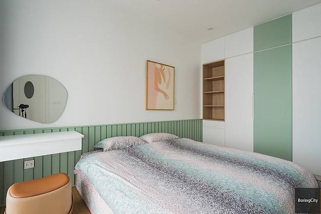 이 집의 개인 공간은 색채로 성격을 구분한다. 한쪽은 생기 넘치는 민트 그린, 다른 쪽은 부드러운 로즈 핑크. 두 색 모두 파스텔 톤이지만 전혀 맥없이 흐르지 않는다.