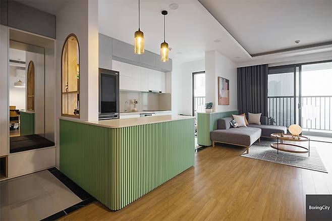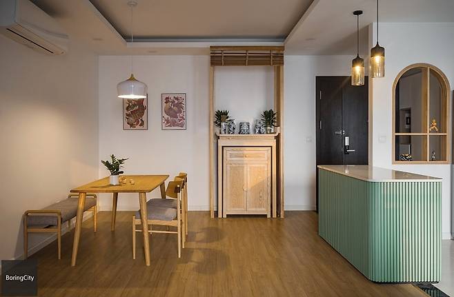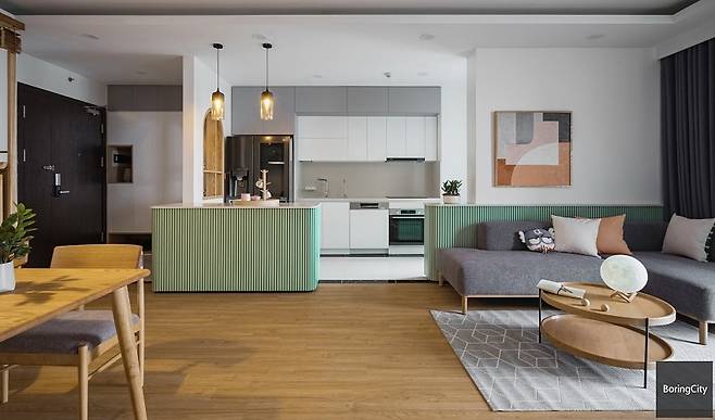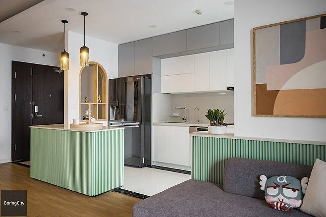 특히 주방의 민트 그린 컬러는 이 여름을 완전히 사로잡을 한 방의 미학이다. 절제된 원목 소재와 만난 민트 톤은 고요함과 활기를 동시에 전하며, 기능성과 심미성을 오롯이 담아낸다.