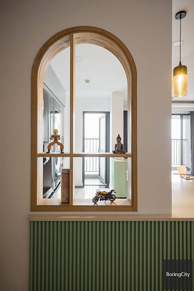 입구 옆 아치형 창문은 이 아파트의 은밀한 마법이다. 단독으로 보면 단순한 건축 요소처럼 보이지만, 이 창이 자연광을 통과시키며 어두운 구석구석을 밝혀주는 순간, 공간이 숨을 쉰다.