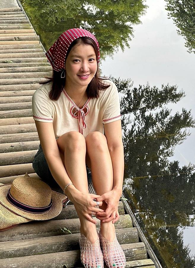공개한 사진에서 이시영은 머리에 스카프를 두르고 끈 여밈 티셔츠에 커팅 데님 반바지를 착용한 나들이룩으로 6살 아들을 둔 엄마라고는 믿기지 않는 소녀 같은 동안 미모를 선보였다.
