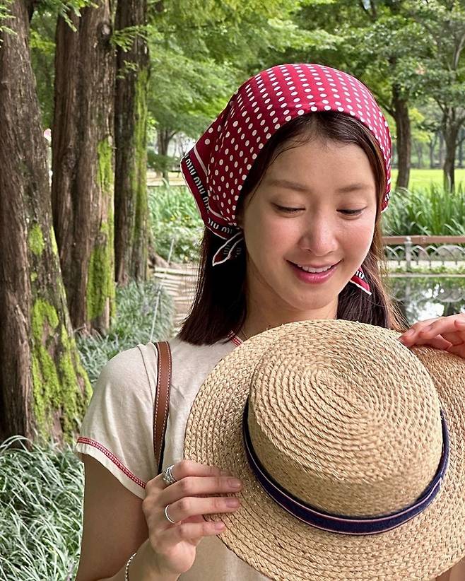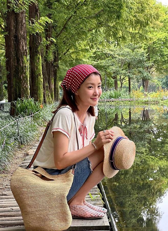 배우 이시영이 스카프에 끈 티셔츠 나들이룩으로 소녀 감성을 한껏 드러냈다.