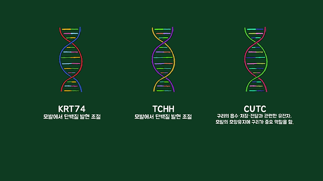 앞서 언급한 것처럼 모든 관여 유전자를 밝혀낸 것은 아니지만, 전광유전체 연관분석(GWAS, Genome Wide Association Study)이라는 유전자 분석 방법을 통해 밝혀진 몇 가지 유전자를 정리해보면 위 3개(KRT74, TCHH, CUTC)의 유전자는 거의 확정적으로 모발의 곱슬기를 결정한다고 합니다.