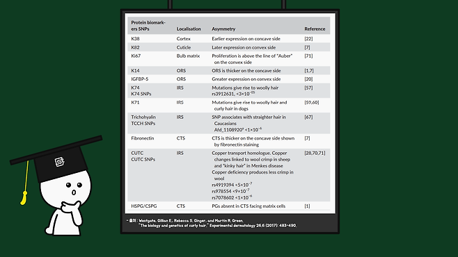 즉, 머리카락의 형태를 결정하는 건 대표적으로 모낭의 모양과 머리카락 내 케라틴 단백질의 분포 정도로 볼 수 있습니다. 하지만 이것 말고도 관여하는 인자가 매우 많아서 계속 밝혀내는 중이고, 대표적으로 곱슬머리에 관여하는 단백질 인자에 대해 정리한 표는 아래와 같습니다.