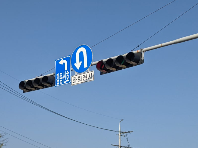 비보호 감응신호는 교차로에 차량이나 보행자가 없을 때는 좌회전 신호를 생략하고, 차량이 감지 구간(흰색 또는 파란색 사각형, ‘감응’ 표시)에 정차하면 센서가 이를 인식해 좌회전 신호를 부여하는 시스템입니다. 교통량이 적거나 사고 위험이 높은 곳에 주로 설치되고, 불필요한 대기 시간을 줄여 교통 흐름을 원활하게 해주는 똑똑한 신호등이죠.