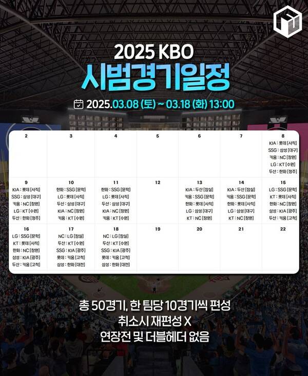 2025 KBO 시범경기는 연장전과 더블헤더가 진행되지 않습니다. 기상 등의 이유로 경기가 취소될 경우에도 재편성 되지 않으며, 새롭게 변경된 규정들이 시범경기부터 적용될 예정입니다.