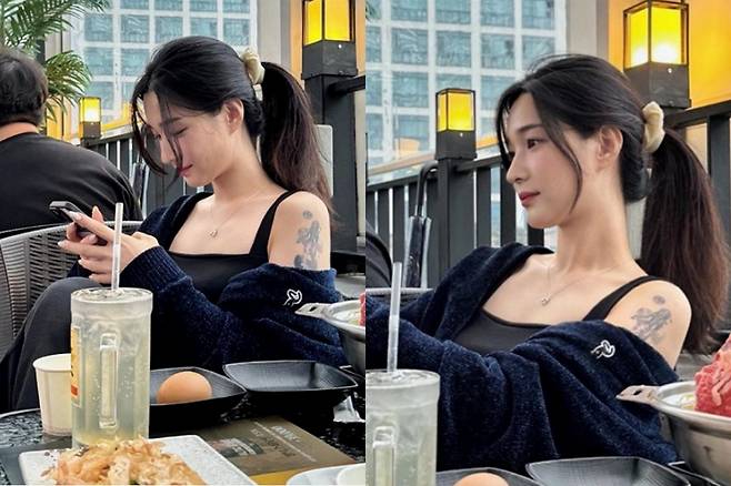 민소매를 입은 채로 식당에서 휴대전화를 보고 있는 모습을 공개했는데, 이때 어깨에서 팔뚝으로 이어진 부위에 대형 문신이 포착돼 팬들을 깜짝 놀라게 했다.
