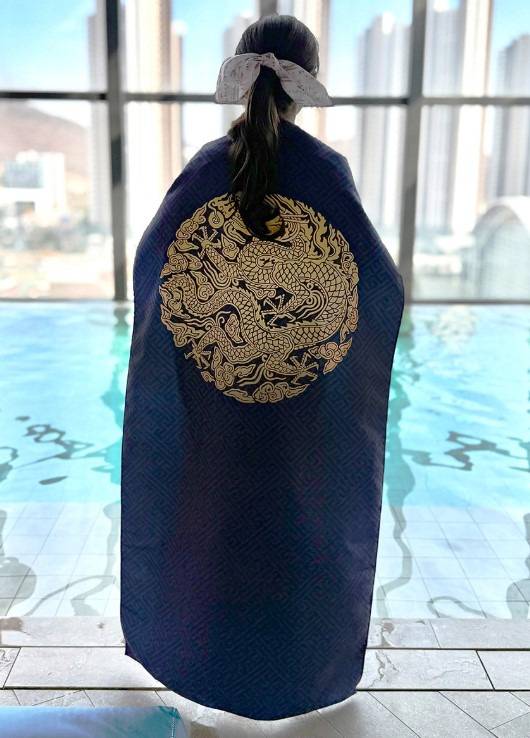 푸른색 바탕 위에 금빛 오조룡을 정교하게 새겨, 조선 시대 곤룡포를 현대적으로 풀어낸 디자인이다. 소재는 폴리에스터 80%, 폴리아미드 20%로 일반 타월보다 조직감이 촘촘하고 촉감이 부드러운 것이 특징이다. 여기에 흡수력과 건조 속도도 빨라 실용성도 훌륭하다. 크기는 1,370 x 68mm로 성인이 사용하기에 충분하다.