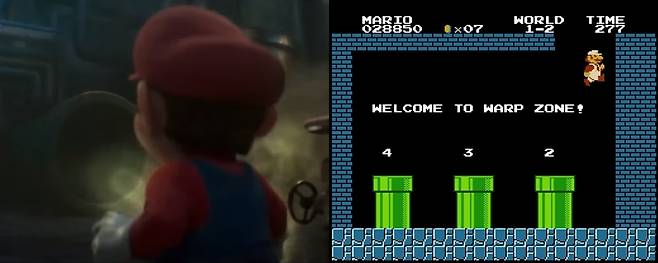 이 '1-2' 스테이지는 다른 스테이지로 갈 수 있는 '워프 존'이 있는데, 영화에서 주인공들은 지하에서 '버섯 왕국'으로 차원 이동을 하게 되죠.