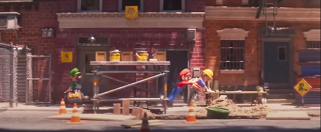 먼저, '마리오' 형제가 첫 번째 임무를 하기 위해, 뛰어가면서 각종 장애물을 통과하는 장면은 게임 <슈퍼 마리오 브라더스>(1985년)의 '횡스크롤'로 연출됐는데요.