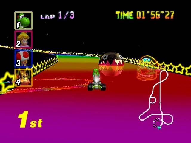 1992년 처음 등장한 <슈퍼 마리오 카트> 이후, 시리즈의 전통을 자랑하는 고난도 코스 '무지개 로드'가 등장합니다.