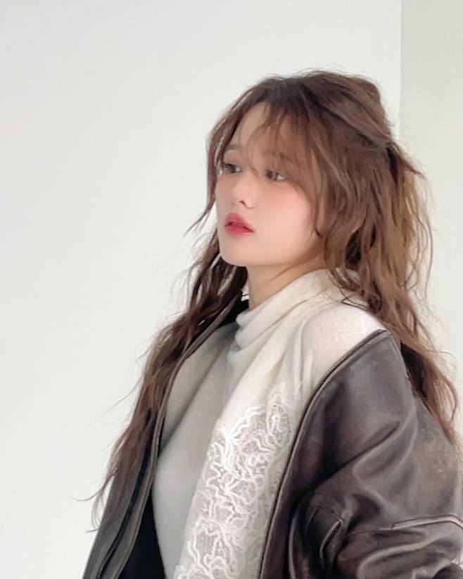 남보라가 화이트 톤의 이너와 그레이 레더 재킷을 매치한 스타일을 선보이고 있다. 레이스 디테일이 가미된 화이트 이너는 여성스러움을 더하는 반면, 오버사이즈 레더 재킷은 시크한 분위기를 연출하고 있다. 헝클어진 듯한 내추럴 웨이브 헤어와 선명한 레드 립 메이크업으로 강렬한 인상을 주고 있다. 벽을 배경으로 한 심플한 구도에서도 그녀의 패션 감각이 돋보인다.