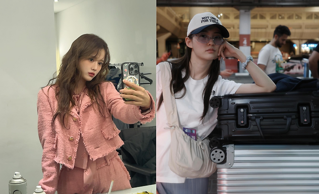 남보라가 공항에서 편안하면서도 스타일리시한 캐주얼룩을 선보이고 있다. "NOT ONLY FOR TODAY"라는 문구가 새겨진 화이트 캡과 베이직한 화이트 티셔츠, 연한 핑크 컬러의 오버사이즈 자켓을 레이어드하여 트렌디한 공항 패션을 완성하고 있다. 투명 프레임의 안경은 지적인 분위기를 더하며, 심플한 액세서리와 함께 세련된 미니멀리즘을 추구하고 있다. 여행용 캐리어에 기대어 있는 모습에서 바쁜 스케줄 속에서도 패션 센스를 놓치지 않는 그녀의 일상을 엿볼 수 있다.
