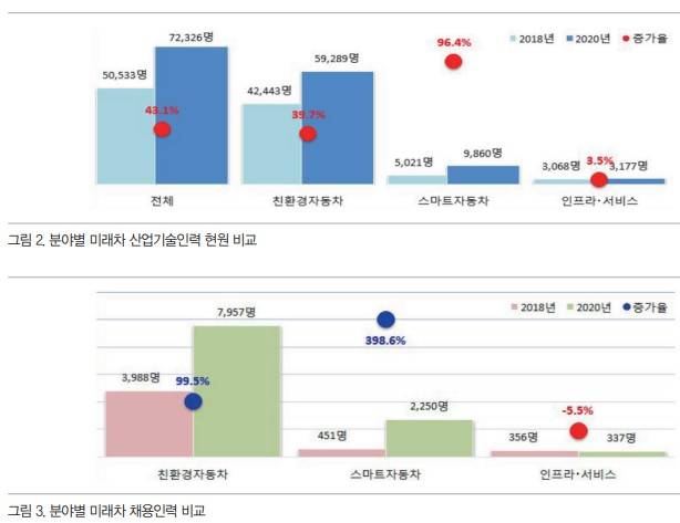 2020년 말 기준으로 미래차 산업기술 인력은 72,326명으로, 2018년의 50,533명에 비해 21,793명 순증가하여 증가율은 43.1%를 기록하였다. 분야별로도 모두 2018년 대비 산업기술 인력이 증가, 특히 스마트자동차 분야가 96.4%로 가장 높은 증가율을 기록하였으며, 반면에 인프라·서비스 분야는 3.5% 증가하는 데 그쳤다. 규모별로는 100인 미만의 사업체에 속한 현원은 감소했지만, 100인 이상 사업체의 현원은 증가하였다.