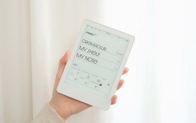 가장 가벼운 이북 리더기를 찾고 있다면 크레마 페블을 추천한다. 조약돌(Pebble)이라는 이름 답게 139g의 무게로 일반적인 책 1권보다 가볍다. 손에 쥐었을 때 그립감을 개선하기 위해 뒷판에 비스듬한 경사를 주고 모서리를 둥글게 설계했다.