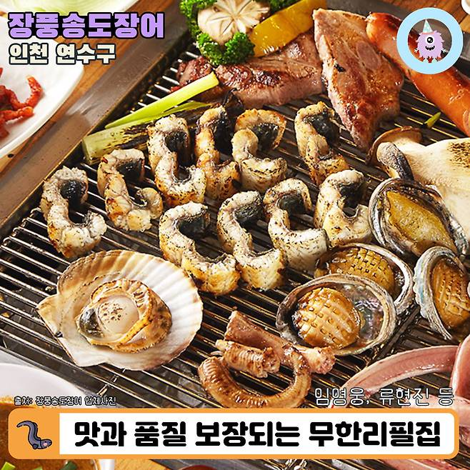 여섯 번째는 인천 송도에 자리한 <장풍송도장어>입니다. 장풍송도장어는 장어와 조개를 무제한으로 먹을 수있는 무한리필 가게라고 해요. 그럼에도 식재료의 맛과 품질이 뛰어나 방문자들의 만족도가 높은 곳이래요!