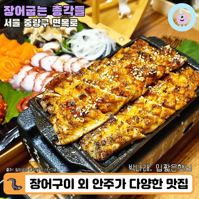 네 번째는 서울 사가정에 위치한 <장어굽는 총각들>입니다. 비싼 장어구이를 합리적인 가격에 제공한다는 자부심을 갖고 운영 중이신 듯했어요. 장어 외에 육회, 연어, 문어&소라 숙회, 매생이 굴떡국과 라면 등 다양한 메뉴를 팔고 있다고 해요.