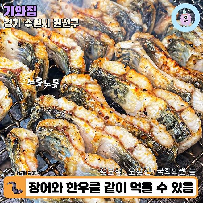 첫 번째로 소개해 드릴 곳은 경기도 수원에 위치한 <기와집>이에요. 장어구이와 한우등심을 같이 구워먹을 수 있고 식사 메뉴로 육회비빔밥, 잔치국수, 물만두 등이 준비되어 있다고 해요.