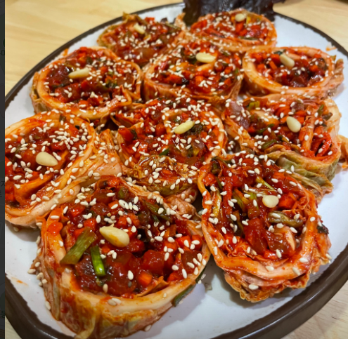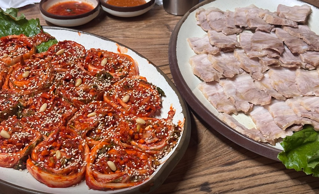 꽃김치: 얇게 말아 꽃처럼 만든 김치가 보쌈과 찰떡궁합! 감칠맛이 고기 맛을 살려줘요