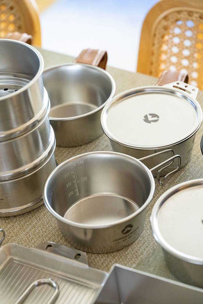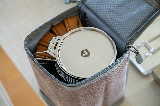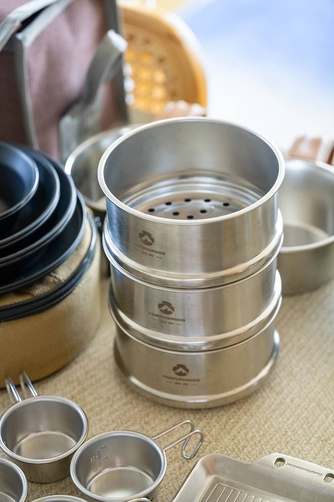 이것도 넣고 저것도 넣고 하면서 가져다니다가 지금은 찜기, 시에라 컵, 뚜껑 이정도만 수납해서 갖고 다닙니다.