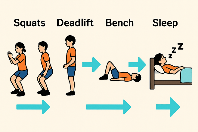 근력 30분 : 스쿼트·데드·벤치 각 3세트 = 체중×0.8 중량부터 점진적 로드