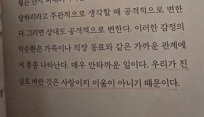 해당 글귀에는 “감정의 악순환은 가족이나 직장 동료와 같은 가까운 관계에서 종종 나타난다. 우리가 진실로 바란 건 사랑이지 미움이 아니기 때문이다"라고 적혔다. 김채원은 마지막 문장에 빨간색 펜으로 밑줄까지 그어두어 눈길을 끌었다.