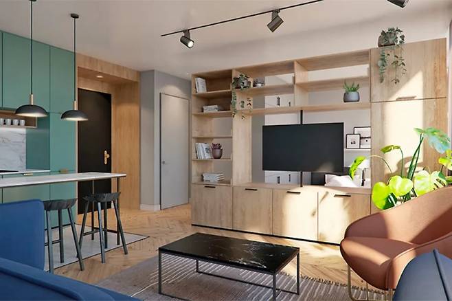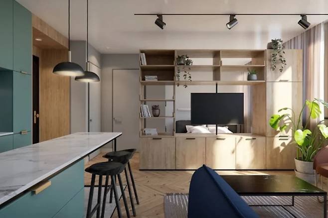 블루 계열 가구가 중심을 이루는 가운데, 그린 소파는 간이 바 형태의 바 테이블로 연장되어 색상의 연결을 유지합니다. 이로 인해 시각적 리듬이 형성되며, 정적인 주방에 활력을 더합니다.