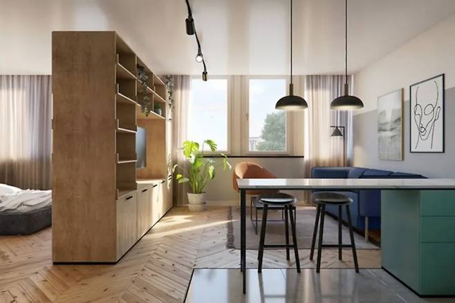 블루와 그린의 이중 구조는 공간을 분할하면서도 시각적 연속성을 유지합니다. 거주자의 취향에 따라 맞춤화된 색상 조합은 독립성과 조화를 동시에 제공합니다.