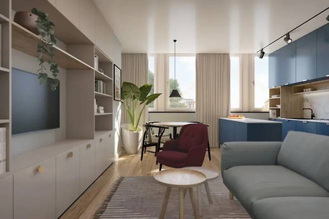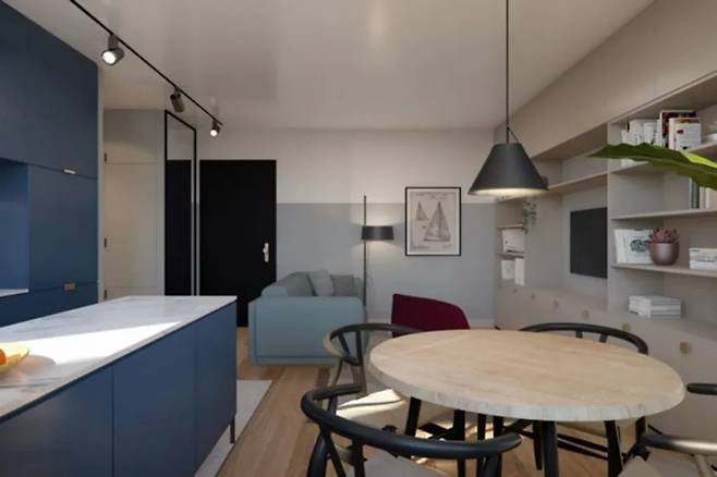 거실과 이어진 다이닝 키친 공간에도 동일한 색상 조합이 적용됩니다. 여기에 모란디 계열의 그레이 핑크가 더해져 시각적 긴장을 완화시킵니다.